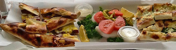 We love Turkish pide (pee-duh) which is sort of like pizza but with a crust we prefer. There are many toppings to choose from. Today, we went for one egg & Turkish sausage and one feta cheese & spinach. Yummy and filling.