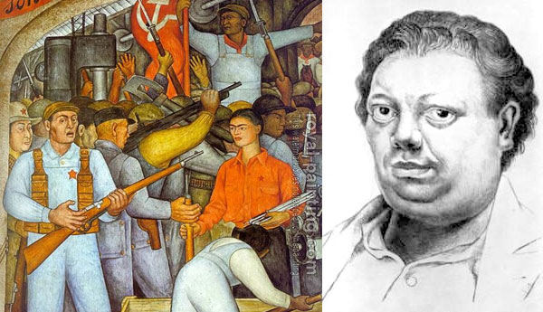 Diego starts off as an accomplished cubist, clearly intending to work in the framework of European avant garde art. He soon turns his talent to two main causes; socialistic revolution and Mexican peasant culture. He uses a kind of simplified, stylized, sculptural monumentalism to elevate images of his humble countrymen to heroic status. His confident, healthy ego shows up in a number of self portraits. Frida shows up in his work, too… in one case, handing rifles to worker revolutionaries.