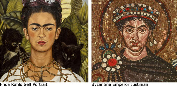 Looking at Frida’s work, I was reminded of Byzantine icons… stiff, often formally symmetrical and symbolic. There’s a lot of “church” in her paintings… pre-Renaissance church, Mexicanized Catholic church. Diego’s work is often churchy, too, but differently. He is a moralist, depicting his peasant players as actors in socialistic “bible stories”.